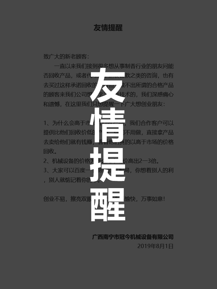 購(gòu)買(mǎi)冠今制香機(jī),享受八大保證,讓您創(chuàng)業(yè)無(wú)憂!冠今制香機(jī)八大支持保證系統(tǒng):強(qiáng)力支持 后顧無(wú)憂 1.現(xiàn)場(chǎng)觀摩:免費(fèi)在制香廠里參觀各種香生產(chǎn)流程,滿意后再做決定。 2.專(zhuān)業(yè)培訓(xùn):購(gòu)制香機(jī)...